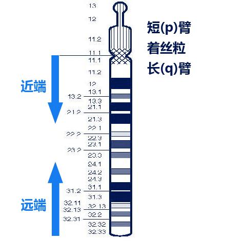 较低的数字,如 q11,接近着丝粒。靠近着丝粒的区域称为近端。诸如 q32 之类的高数位于染色体尖端附近,并且由于远离着丝粒而被称为远端。