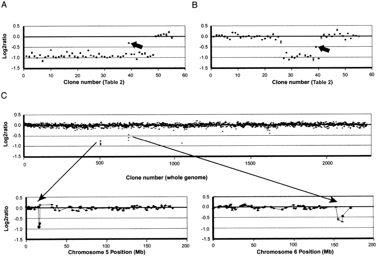 最近、著者らは、マイクロアレイCGHを実施する方法を開発した(Solinas-Toldo et al. 1997; Pinkel et al. 1998; Pollack et al. 1999; Snijders et al. 2001; Fiegler et al. 2003). 我々のアレイは、BACSやPACSなどの大型挿入ゲノムクローンから作製されたアレイエレメントを使用し、個々のクローンに影響する単一コピー異常の信頼性の高い検出を可能にするのに十分な測定精度を有する。 ゲノム配列上の各クローンの位置は、STSまたは末端配列などの配列タグを用いて決定される。 このようなアレイで得られる解像度は、クローン間のゲノム間隔およびクローン長によって決定される。 重複クローン(Albertson et al. 2000) を用いることにより、BACの長さの一部の解像度を得ることができる。