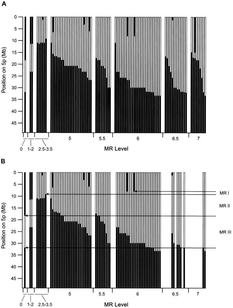 5p欠失に対するMRレベルの依存性。 A、遅延評価が入手できた全91例のデータ。 黒い部分は、それぞれの場合に保持されている染色体領域を示し、5pterからの物理的位置に対してプロットした。 セントロメアはグラフの下端のすぐ下にある。 欠失に対する遅延レベルの依存性は明白であるが、一般的な傾向には小さすぎるように見える欠失を伴う場合が多い。 MRレベル5については、各レベル内の近位欠失境界の順にデータがプロットされる。
