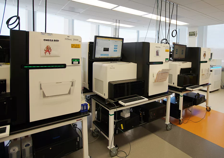写真2枚目に映る機械はシークエンサーという機械で、HISEQとNEXTSEQという機械がそれぞれ7台ずつあります。この機械で1日に959人分の検体が検査できるそうです。