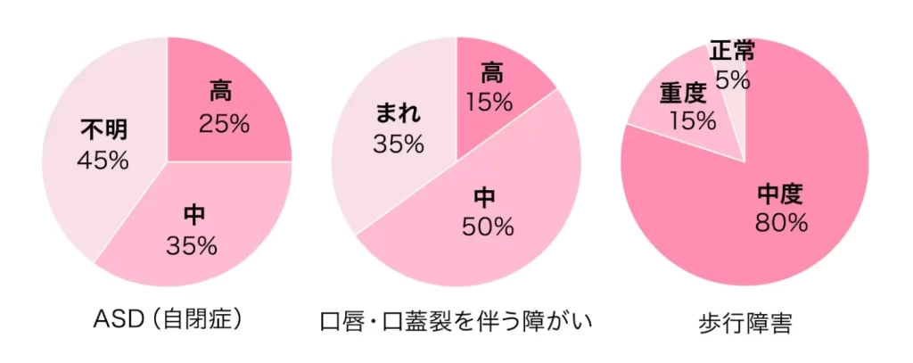 口唇口蓋裂については、全体の約10〜15%で高頻度に合併することが知られています。約50%前後のケースでは「ときどき見られる」「報告例が多い」とされますが、逆に30〜40%の範囲ではほとんど見られないか、報告が極めて少ないという特徴があります。