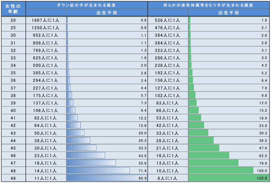 出産時のお母さんの年齢が高くなればなるほど、産まれてくる赤ちゃんに染色体異常が見られる確率が高くなります。特に40代以上で出産する高齢出産の場合は飛躍的に確率が高くなるのが上のグラフからもみて取れます。