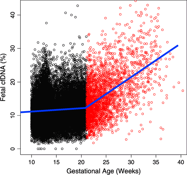 The ratio of cfDNA (FF) gradually increases as the number of weeks of pregnancy progresses.