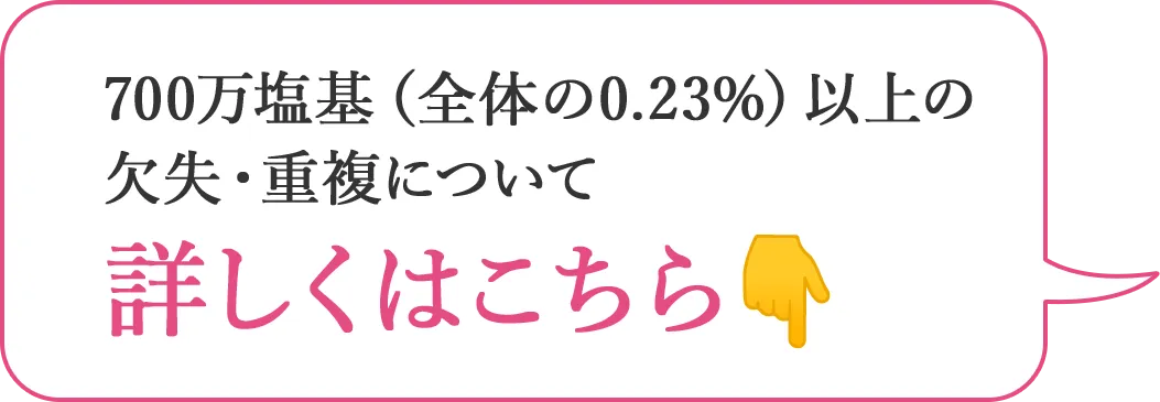 ヒロクリニックが検査を依頼している東京衛生検査所の次世代シーケンサーでは、700万塩基(全体の0.23%)以上の欠失・重複が検出された場合に、検査結果として報告しています。