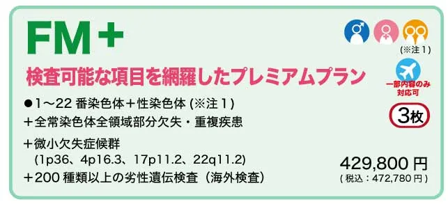 この図では、流産リスクの高い13・18トリソミーやモノソミー、また出生後に知的障がいや不妊症の原因となる性染色体異常など、幅広い疾患をその頻度とともに分類。どの検査プラン(GMプラン・FM+プラン)でどの領域をカバーできるのかも一目でわかるようになっています。