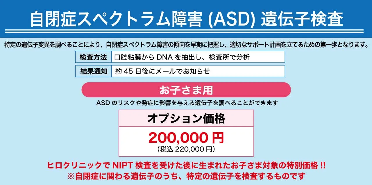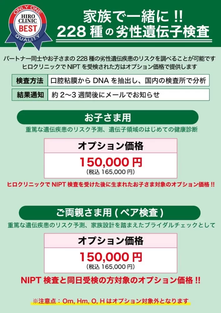 Q228種類の劣性遺伝疾患を調べられますか?はい、オプション検査としてご利用いただけます。 劣性遺伝検査はNIPTと一緒に受けていただく事で単体で検査をするよりもお安く検査が可能となります。
