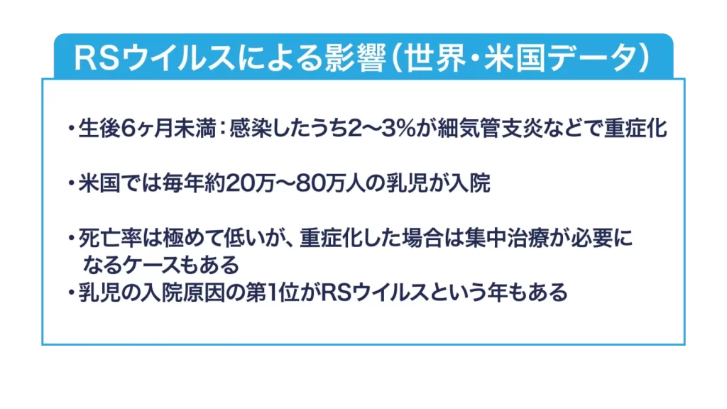 特に生後6ヶ月未満の赤ちゃんにとって、RSウイルス感染症は重症化リスクが高く、細気管支炎や肺炎を引き起こす可能性があります。厚生労働省の統計によれば、日本では毎年約3万人の乳幼児がRSウイルス感染症で入院しており、特に早産児や基礎疾患を持つ赤ちゃんは重症化リスクが高いとされています。