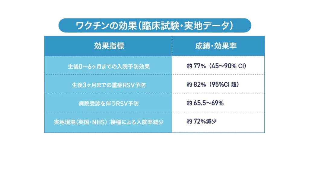 具体的には、ワクチン接種群では生後90日以内の重症RSウイルス感染症による医療機関受診が0.6%だったのに対し、プラセボ群では3.2%でした。この差は統計学的に有意であり、ワクチンの明確な効果を示しています。