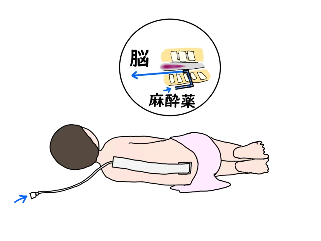 麻酔科医が背中の適切な位置を確認し、局所麻酔で皮膚を麻痺させた後、硬膜外腔にカテーテルを挿入します。このカテーテルは出産が終わるまで留置され、ここから継続的に麻酔薬が投与されます。