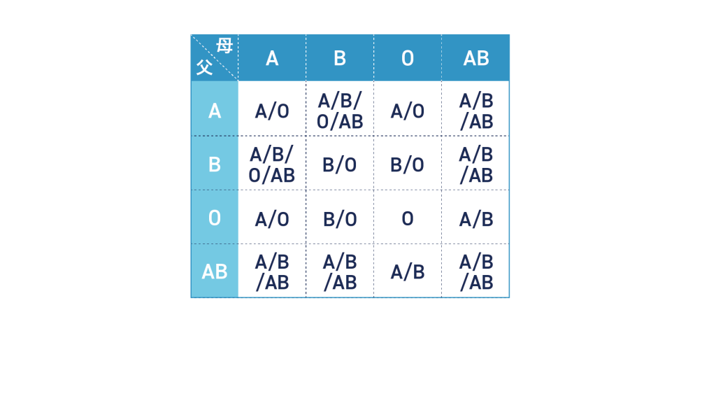 このように、両親の遺伝子型によっては、4種類すべての血液型が生まれる可能性があります。