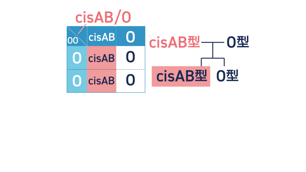 例えば、お父さんが「シスAB型(AB / O)」で、お母さんが「O型(O / O)」だったとします。