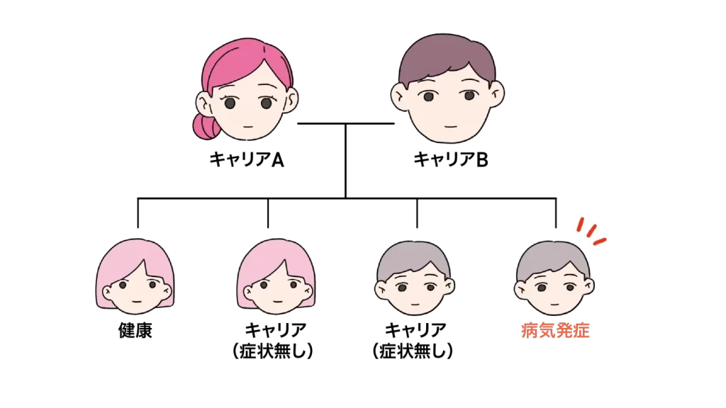 • 片方だけ異常:もう片方の正常な遺伝子がカバーするため、病気は発症しません。健康に生活できます。この状態の人を**「キャリア(保因者)」**と呼びます。