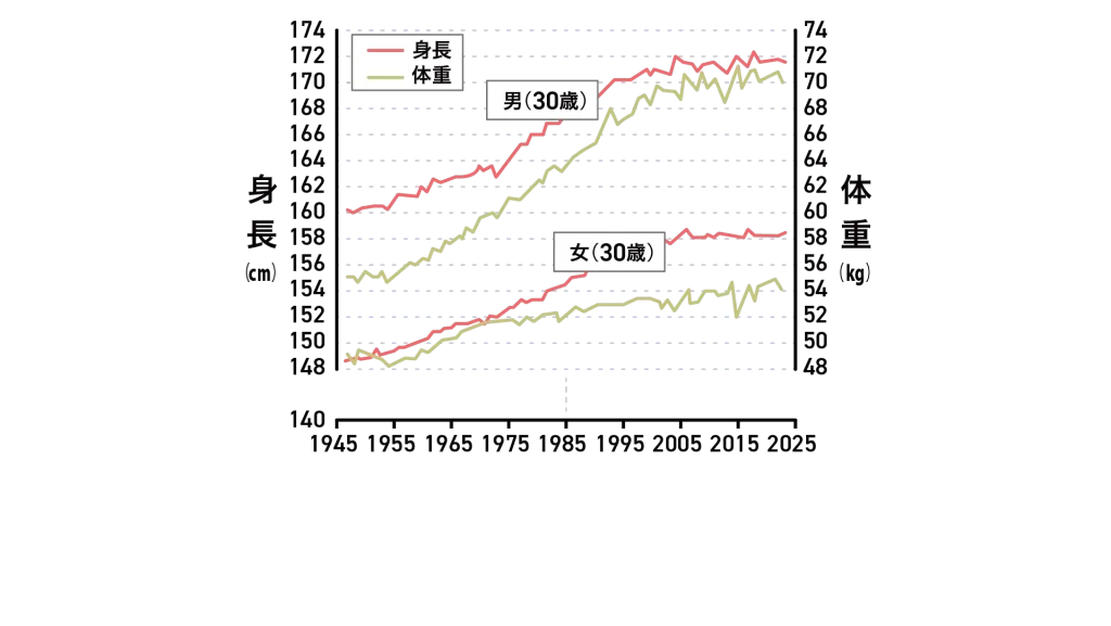 高度経済成長期にかけて、日本人の平均身長は劇的に伸びました。これは、栄養状態や衛生環境といった**「環境要因の改善」が最大の要因です。しかし、1990年代以降、この身長の伸びは頭打ち**になっています。