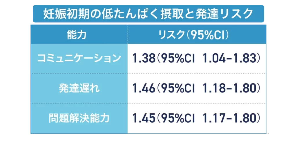 この研究では、妊娠初期(12〜16週頃)の母親の食事内容を調査し、生まれた子供が3歳になった時点での発達状況を追跡しました。その結果、タンパク質の摂取量が極端に低かった母親から生まれた子供には、以下のような発達の遅れが見られる傾向がありました。