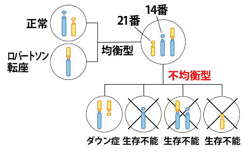 人間の細胞の中には、染色体(DNAがまとまったもの)が46本ありますが、ロバートソン型転座(rob(14;21))というのは、「14番」と「21番」の染色体がくっついてしまって、1本になっている状態のことです。