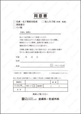 健康保険証提示についてのお願 健康保険証は、月初のご来院と変更があった場合に必要となります。 ご提示がない場合は、自費でのお支払いとなりますのでご了承ください。 未成年者の施術・手術について 未成年の方のみの初診の診察はトラブルのもとになりますので、 親権者の方同伴でお願いします。 また、未成年者の施術及び手術には親権者の同意が必要となります。 しかし、保護者が同意されていても手術を受ける本人(未成年者)が手術を拒否している場合には、手術をお断りする場合があります。家族間でよく相談されてからご来院ください。 クレジットカードご使用について 保険診療外の場合、クレジットカードでのお支払いが可能です 当院では保険診療外の場合、クレジットカードでのお支払いが可能です。 対応しているカードは「Visa」「Master Card」「JCB」「アメリカン・エキスプレス」「ダイナースクラブ」「銀聯(ギンレイ)カード」になります。 クレジットカードでのお払いを希望される際は受付スタッフまでお気軽にお申し付けください。 事前記入をお願いします 皮膚科外来問診票 問診票を事前にダウンロードしご記入いただいてお持ちいただけますと、受付がスムーズになります。 皮膚科外来問診票(pdf) 同意書 当院での施術及び手術を受ける際には手術同意書への同意が必要となります。 同意書をダウンロードし必要事項をご記入の上クリニックにご持参ください。 また、未成年者は必ず親権者の同意が必要となります。 ※必ず親権者本人がご記入ください。 手術同意書ダウンロード(pdf)